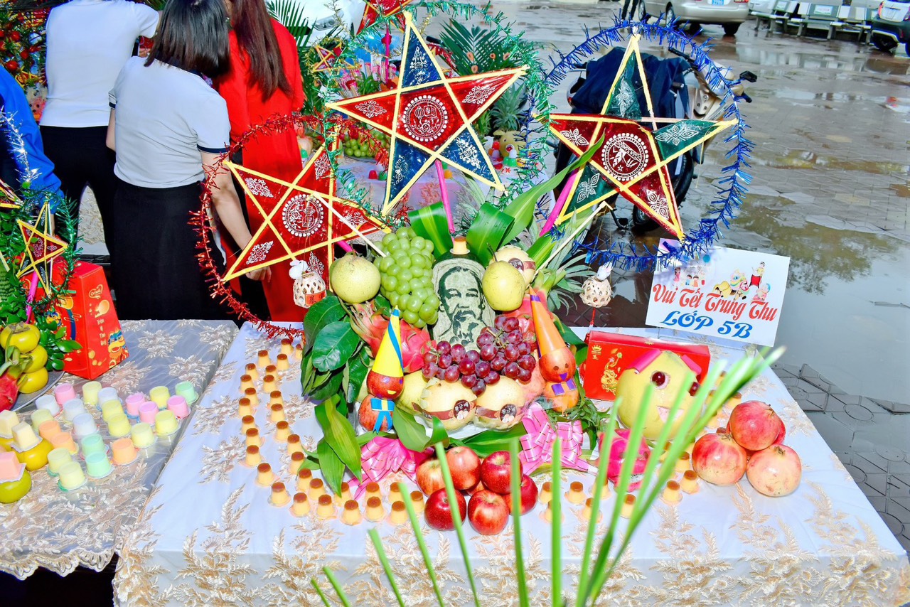 Các bậc phụ huynh lớp 5B cùng giáo viên chủ nhiệm và các em học sinh đã chuẩn bị mâm cỗ Trung thu thật nhiều ý nghĩa.