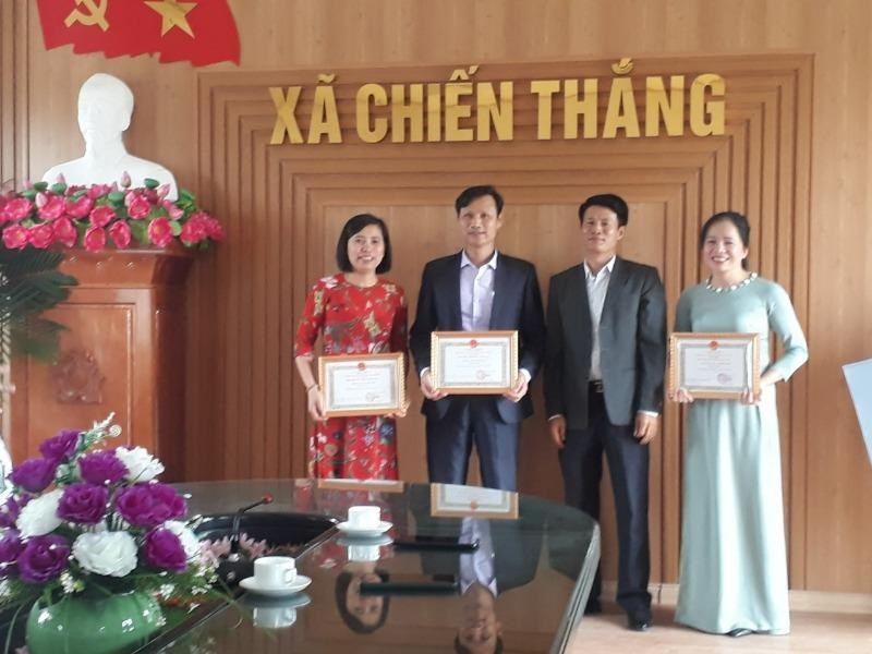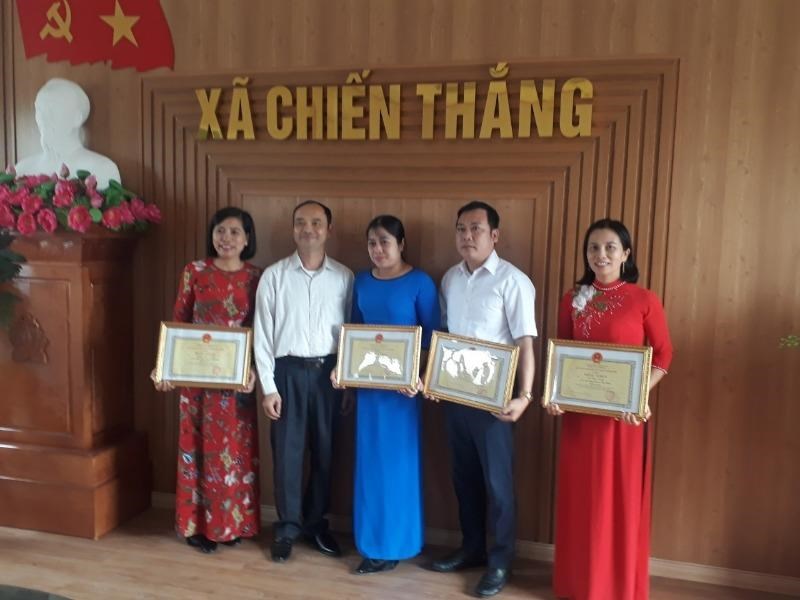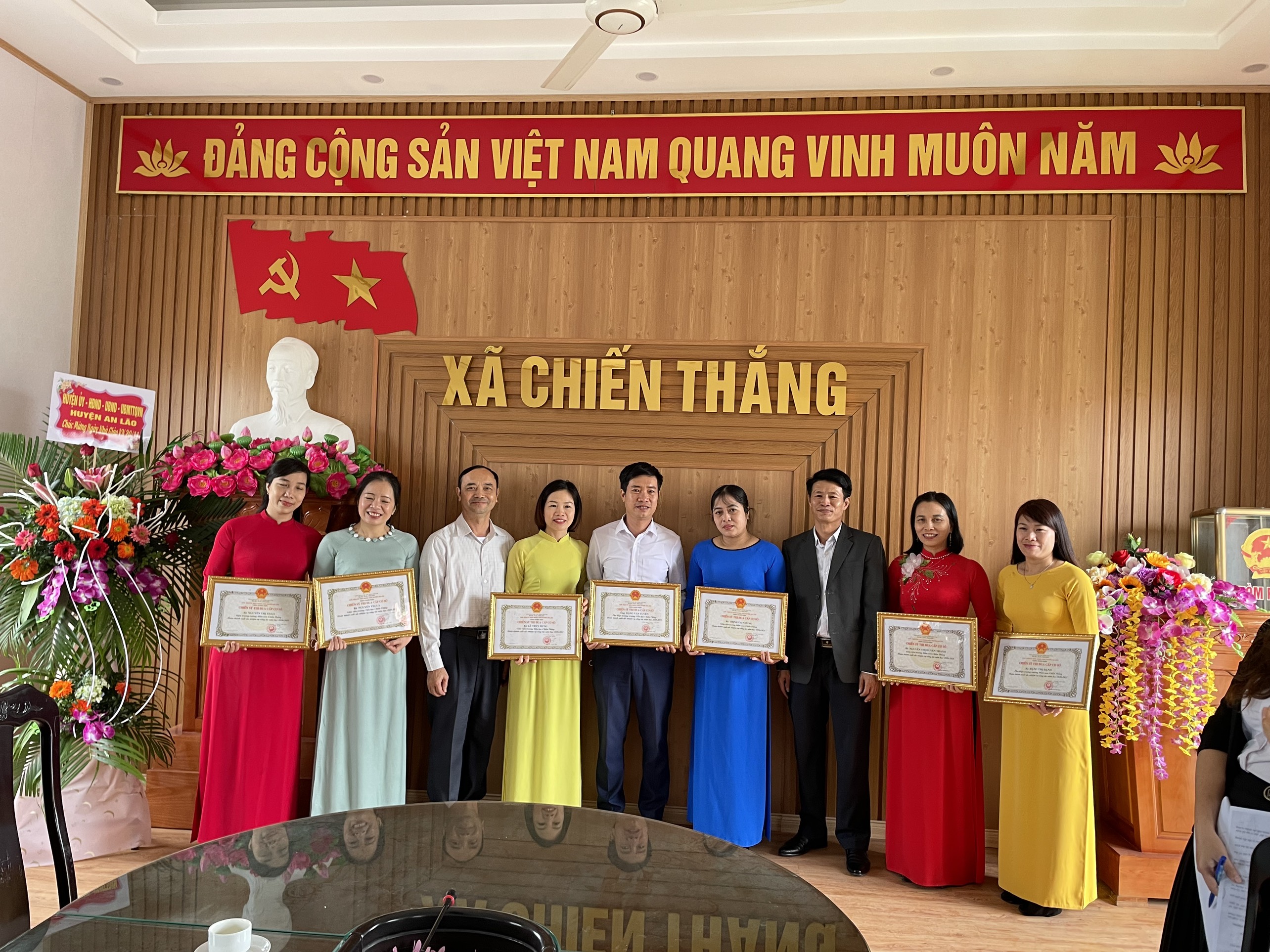 Thừa ủy quyền, các đồng chí Thường trực Đảng ủy - HĐND - UBND xã trao tặng cho các thầy cô đạt thành tích của 3 nhà trường của Chiến Thắng rất vinh dự với các danh hiệu: