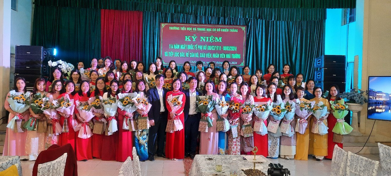 Để thể hiện sự tôn vinh phụ nữ - một nửa thế giới, chiều ngày 7/3/2024 trường TH & THCS Chiến Thắng long trọng tổ chức kỉ niệm 114 năm ngày Quốc tế phụ nữ (08/03/1910 – 08/03/2024) và tiếp xúc dâu, rể CBGVCNV nhà trường. Sân khấu được trang hoàng lộng lẫy, tràn ngập hoa và quà. Chị em phụ nữ có mặt trong buổi lễ thướt tha trong tà áo dài cổ truyền đã nhận được những lời chúc tốt đẹp nhất từ đấng mày râu. Đây cũng là cơ hội để một nửa thế giới thể hiện sự chăm sóc, yêu thương với người phụ nữ mà họ yêu quý.