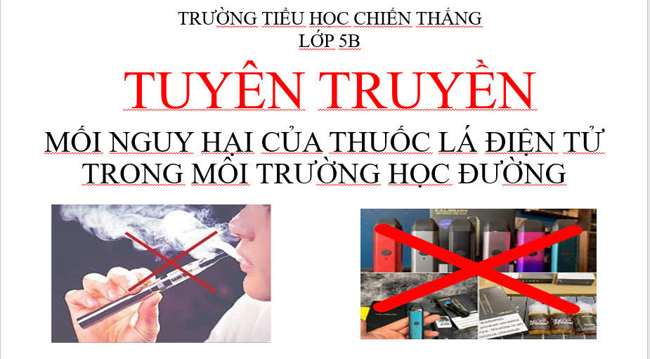 Trong những năm gần đây, tình trạng trẻ vị thành niên, học sinh hút thuốc lá truyền thống và đặc biệt là hút thuốc lá điện tử đang diễn ra hết sức phức tạp và có chiều hướng gia tăng. Thực trạng này không chỉ ảnh hưởng đến sức khỏe của chính bản thân các em, mà còn ảnh hưởng đến sức khỏe của bạn bè và người xung quanh. Nhằm trang bị kiến thức cho các em học sinh về tác hại của thuốc lá điện tử đối với sức khỏe của lứa tuổi học đường, sáng ngày 19 tháng 12 năm 2022 Lớp 5B Trường Tiểu học Chiến Thắng đã tổ chức buổi tuyên truyền về “Phòng chống tác hại của thuốc lá điện tử trong môi trường học đường” tại giờ Giáo dục tập thể.