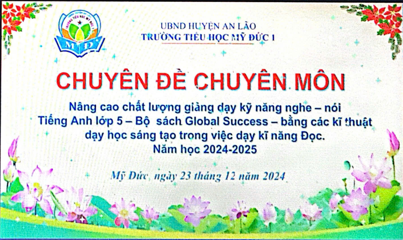 Hoạt động SHCM là một hoạt động nhằm bồi dưỡng chuyên môn, nghiệp vụ, năng lực sư phạm cho giáo viên. Sinh hoạt chuyên môn cũng góp phần tháo gỡ những khó khăn, vướng mắc trong quá trình giảng dạy. Tên chuyên đề: "Nâng cao chất lượng giảng dạy kĩ năng nghe- nói Tiếng anh lớp 5_ Global success bằng các kĩ thuật dạy học sáng tạo trong việc dạy kĩ năng Đọc. Giáo viên lên chuyên đề là cô Nguyễn Thu Thủy- giáo viên Tiếng Anh trường TH Mỹ Đức 1. Tiết chuyên đề được đánh giá cao và rất hữu ích.